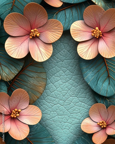 © Nob, Obraz premium Peach Flowers and Teal Leaves on Cracked Background