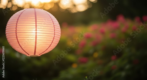 Obraz premium Peach lantern flowers hanging in a tranquil garden at sunset