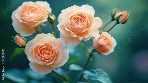 © Zie, Obraz premium Peach Roses in Bloom: A Garden's Delicate Beauty
