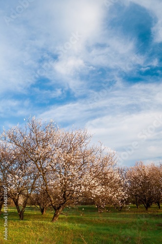 Fototapeta premium Peach trees in full bloom on a bright spring day, idyllic and peaceful.