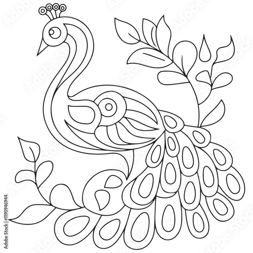 © firoz, Fototapeta premium Peacock and ivy leaf hand drawn for adult coloring book