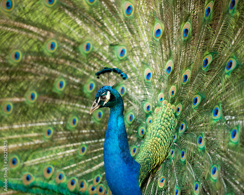© Aline, Fototapeta premium Peacock bird Stock Photos. Peacock bird close-up profile view fold open fan. Train and head ornament. Peacock bird, the beautiful colourful bird. Image. Picture. Portrait. Photo.