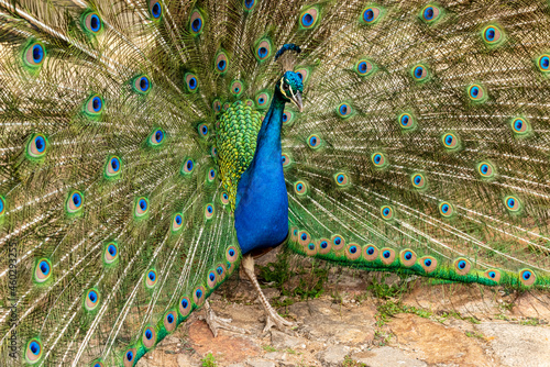 Obraz premium Peacock displaying its colorful feathers.