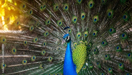 © Aldi, Obraz premium Peacock displaying its vibrant plumage in sunlight