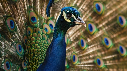 © AkuAku, Fototapeta premium Peacock displaying its vibrant tail feathers with space for text