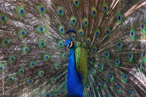 Obraz premium Peacock displaying vibrant feathers in a natural setting during daylight hours