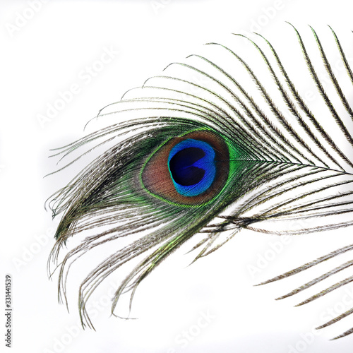 Obraz premium peacock feather close-up on a white background isolated