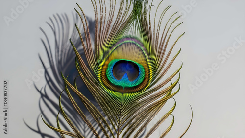 Fototapeta premium peacock feather close up, Vibrant Peacock Feather Close-Up With Iridescent Eye Pattern And Delicate Barbs, Nature Photography Artwork