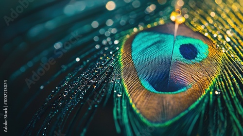 © Anna, Naklejka premium Peacock feather close-up with water drops Feathers vary from green to blue
