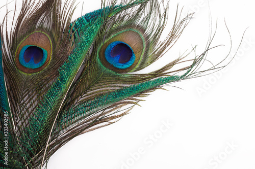 © vetre, Obraz premium Peacock feather in royal style on white background. Tropical abstract background. Exotic bird.
