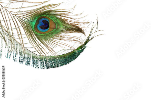 Obraz premium peacock feather in white background with text copy space