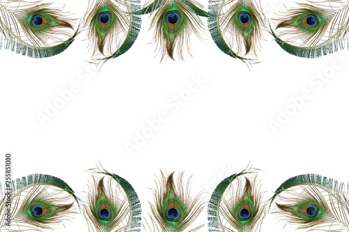 Obraz premium peacock feather in white background with text copy space
