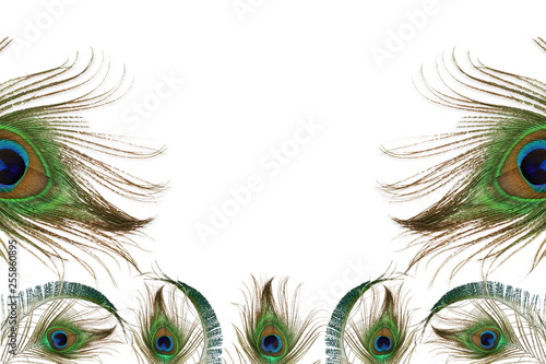 Obraz premium peacock feather in white background with text copy space