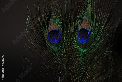 © daryakomarova, Obraz premium Peacock feather isolated on a black background