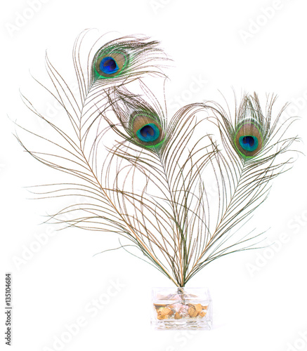 Obraz premium Peacock feather isolated on white background. Close up.