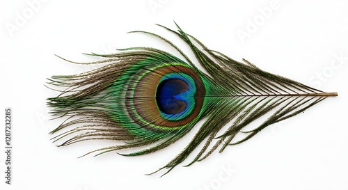 © GUNARTOGRAPHY, Obraz premium Peacock Feather Lying on a White Background with Vivid Colors