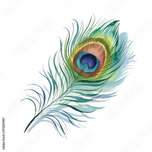 © creativemahfuz, Obraz premium Peacock feather on clear backdrop, decorative element for invitations and crafts embellishment, perfect for adding a touch of nature.