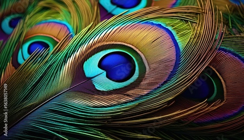 © Indian Gallery, Obraz premium Peacock Feather Wallpaper - Detailed Bird Feather Background for Krishna Janmashtami