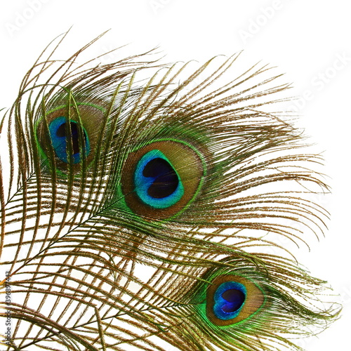 © gv image, Obraz premium peacock feathers in white background with text copy space