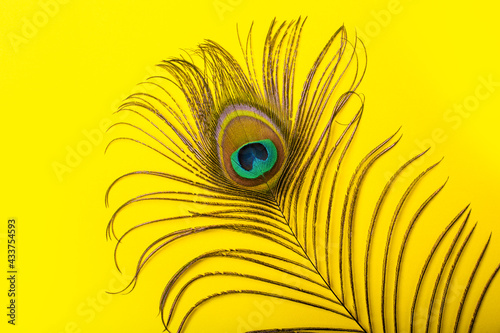Obraz premium peacock feathers iridescent blue green gold with a peephole on a bright yellow background
