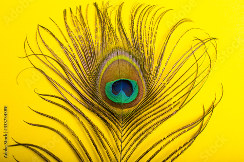 Obraz premium peacock feathers iridescent blue green gold with a peephole on a bright yellow background