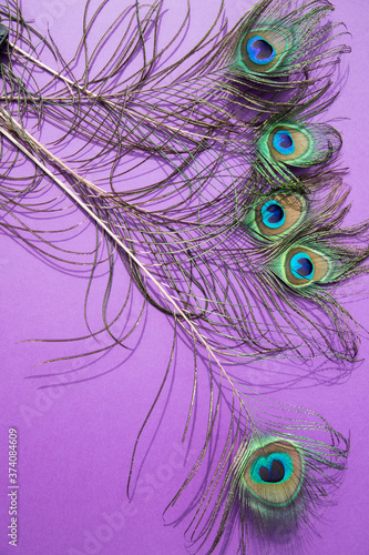 Obraz premium Peacock feathers lie on a lilac background .Vertical orientation.
