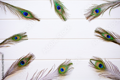Obraz premium Peacock feathers on a white wooden background as a space for design with...