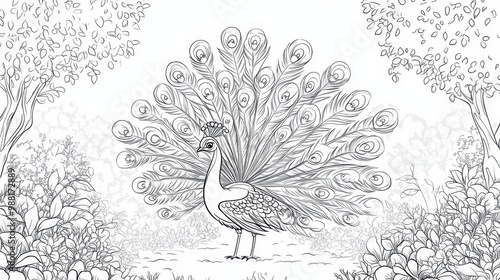 © AriyaniAI, Obraz premium Peacock in a Forest, Black and White Illustration
