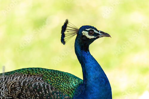 © Gur, Obraz premium Peacock in the park on a bright sunny day. Peacock looks into the camera.