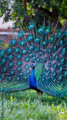 © Passion, Obraz premium Peacock is standing in a grassy field with its feathers spread out