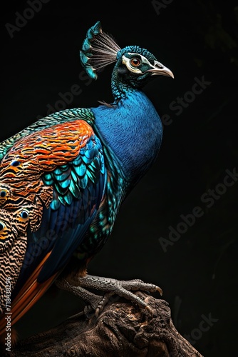 © Eyestetix Studio, Obraz premium Peacock on small root isolated on black AI Generative