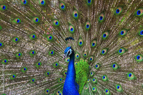© whatsabz, Naklejka premium peacock or peafowl is spread tail feathers
