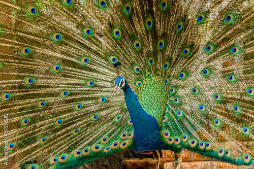 Fototapeta premium Peacock. Portrait of male peacock displaying his tail feathers.