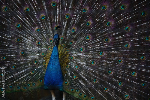 Naklejka premium Peacock spread wings for courtship at a zoo in Japan.
