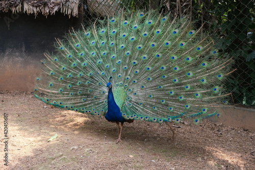 Obraz premium peacock spreading splendid tail under sunshine