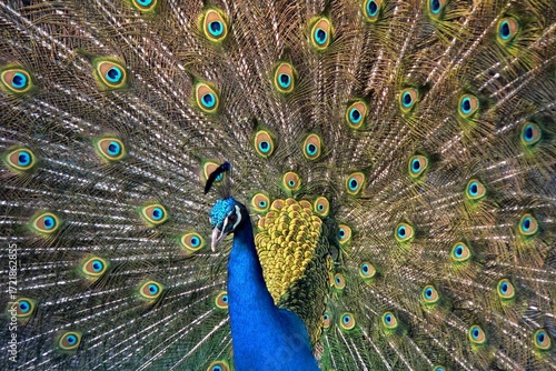 © insideportugal, Fototapeta premium Peacock spreading tail displaying vibrant eye feathers