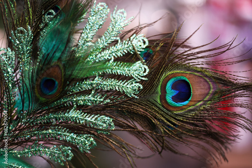 © Viktoriia Pletska, Obraz premium Peacock tail close-up. Peacock feathers