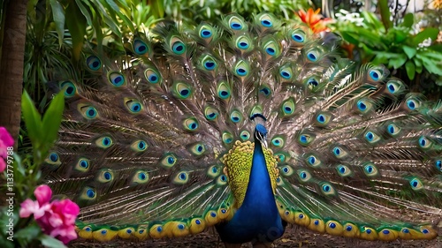 Obraz premium Peacock , Vibrant Peacock Displaying Its Magnificent Feathers in a Colorful Garden Setting