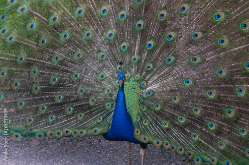 Naklejka premium Peacock with bright beautiful blue and green feathers.