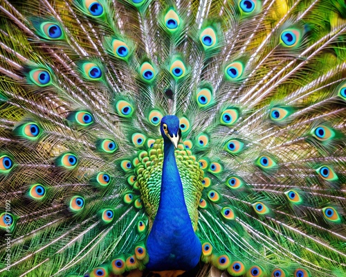© Phonlasit, Fototapeta premium Peacock with fanned tail, peacock with feathers
