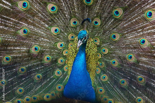© RuskaDesign, Naklejka premium Peacock with feathers out. Open tail.
