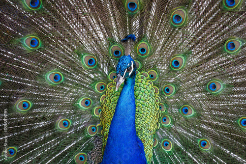 Obraz premium Peacock, with full display of iridescent tail feathers, spectacular courtship dance