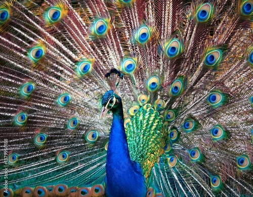 © Hatzfeld, Naklejka premium Peacock with fully fanned tail displaying vibrant colorful feathers