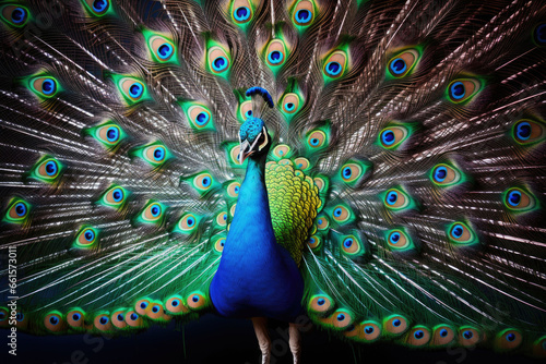 Obraz premium Peacock with with fully fanned aquamarine tail. Generative AI