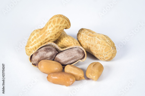 © amnarj2006, Obraz premium Peanuts in shells on white background.
