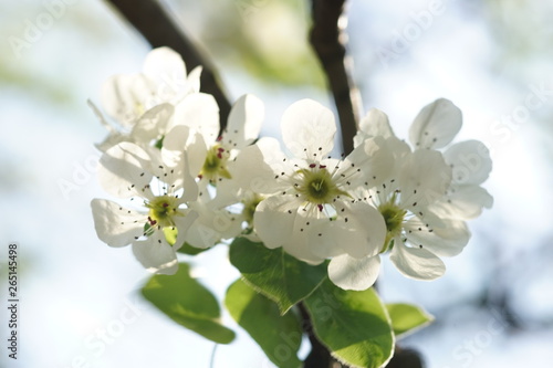 © Omega, Fototapeta premium Pear tree blossom in spring garden closeup