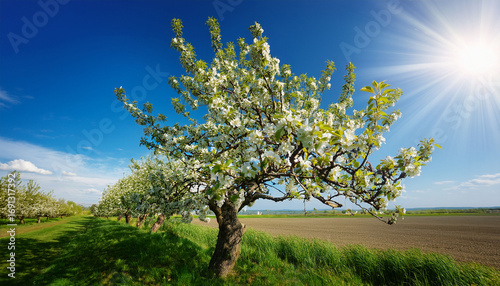 © Seraphina, Fototapeta premium Pear Tree In Blossom With Green Fruit Under Bright Blue Sky