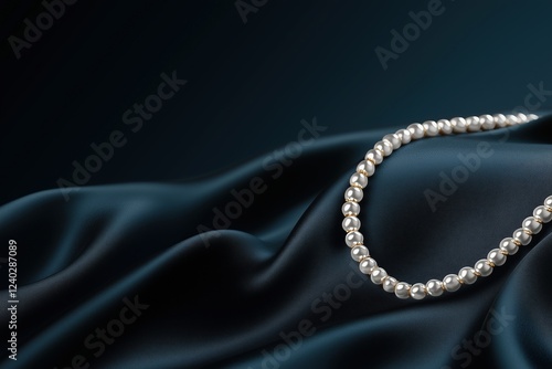 Fototapeta premium Pearl necklace draped on luxurious dark fabric with soft folds. timeless jewelry and elegant styling