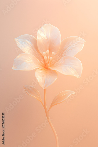 Obraz premium Pearlescent lily flower on pastel peach background – minimalist botanical 3D render, soft elegant bloom, modern aesthetic, vertical composition
