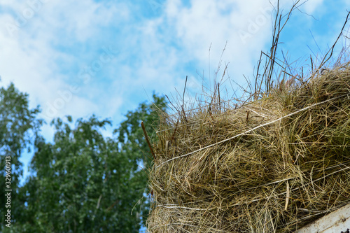 © Светлана Акифьева, Fototapeta premium Peasant car with bales of hay against the blue sky. Haystack, forage for the winter